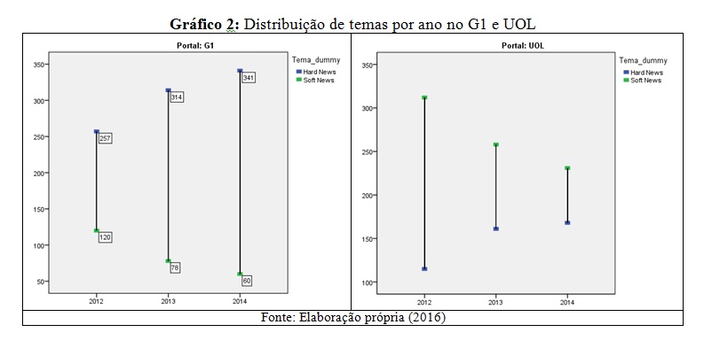 - Gráfico 2 – Distribuição de temas por ano no G1 e UOL