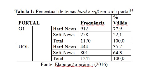 - Tabela 1 - Percentual de temas hard x soft em cada portal