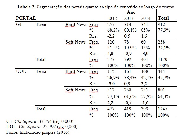 - Tabela 2 - Segmentação dos portais quanto ao tipo de conteúdo ao longo do tempo